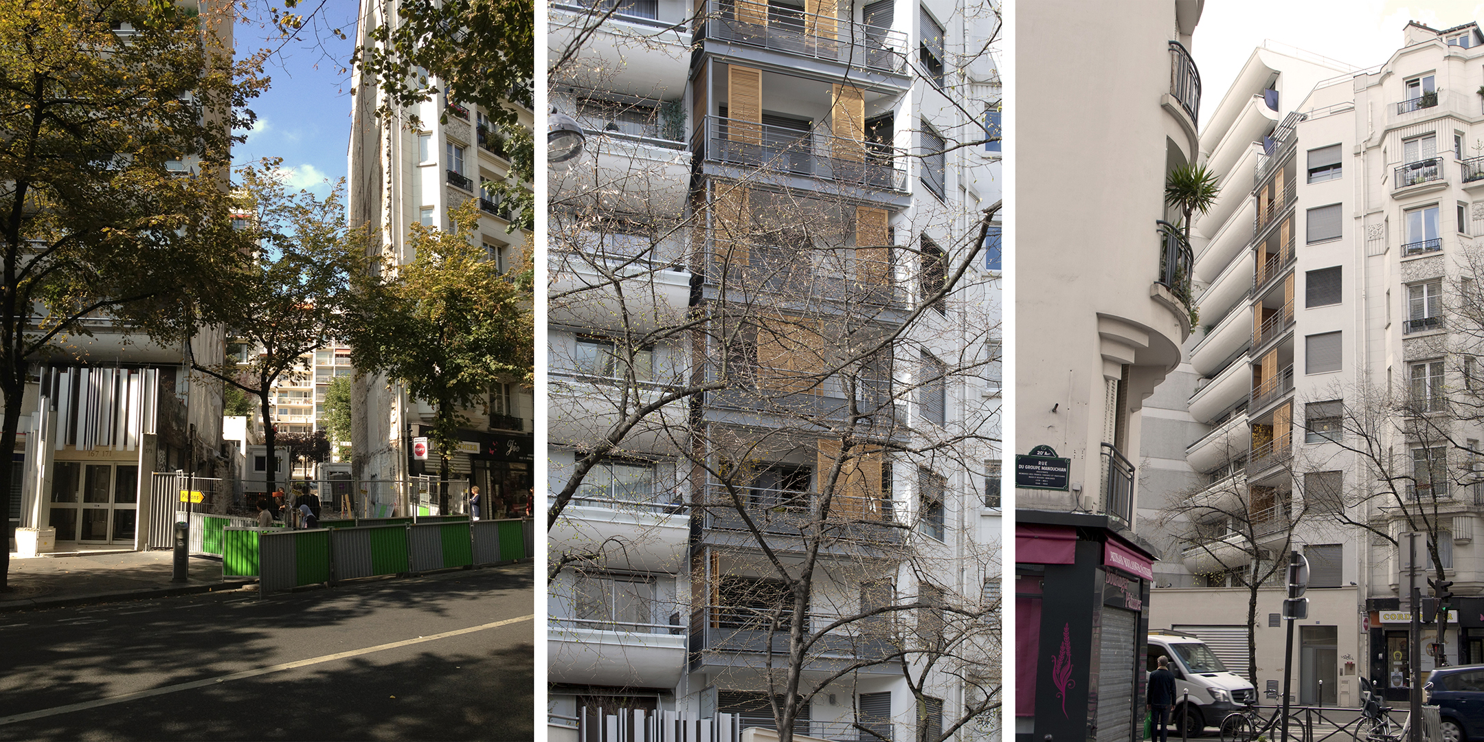 Ces éléments sont répartis en deux immeubles implantés aux alignements sur l’avenue Gambetta et la rue Saint-Fargeau. Les deux bâtiments mettent en œuvre un vocabulaire unique en ménageant quelques adaptations aux avoisinants. Ainsi, le rez-de-chaussée sur l’avenue Gambetta est traité en pierre semi-porteuse afin de conférer au pied d’immeuble un caractère “haussmannien”. Le rez-de-chaussée de l’immeuble sur la rue Saint-Fargeau est quant-à-lui traité de façon globale, tranchant davantage par son caractère contemporain et renvoyant au traitement du pied d’immeuble des commerces situés au n°32.