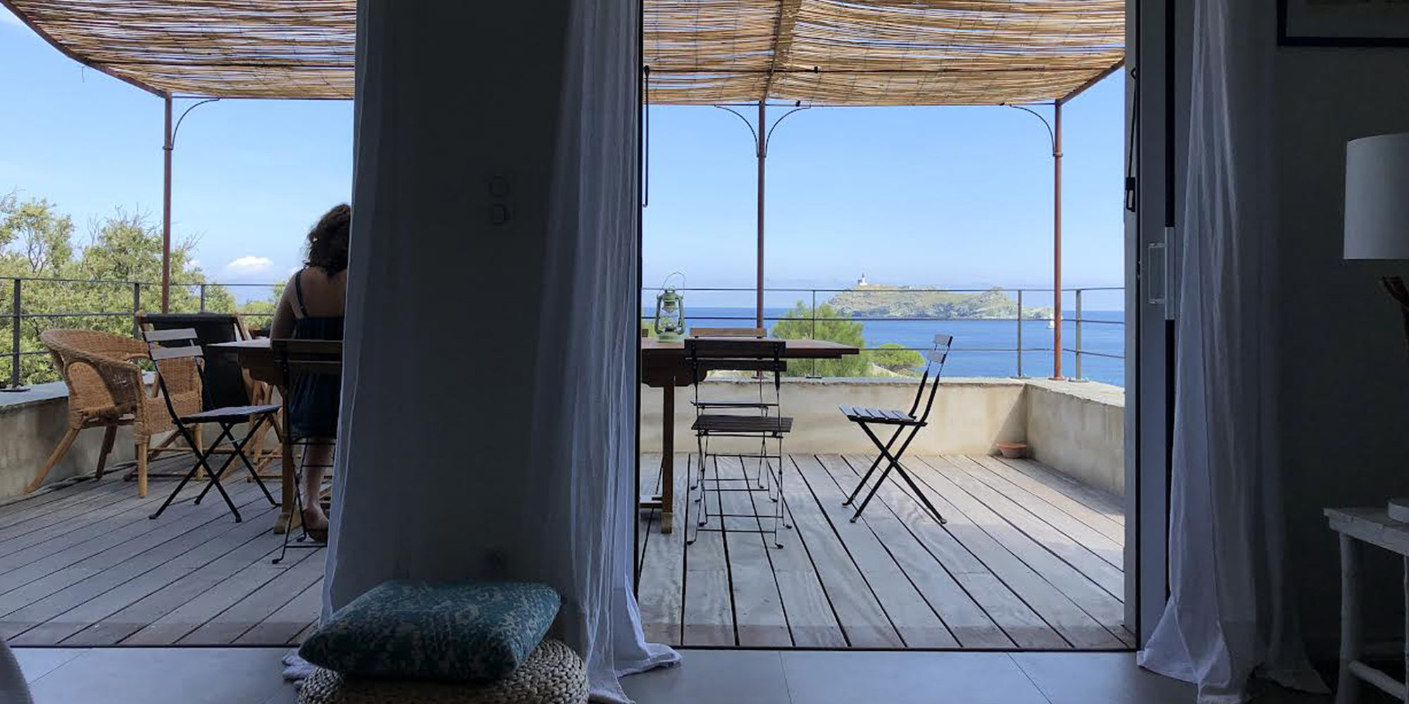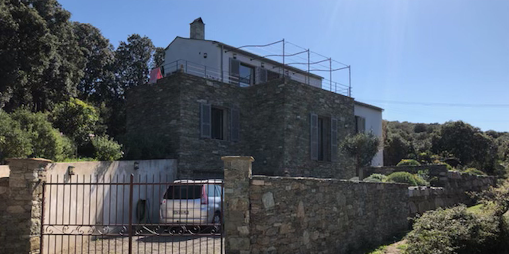 Située dans le parc naturel marin du cap corse ultra protégé, la maison s’insère dans le respect du vocabulaire obligatoire sur ce site. toiture en lauzes, pierres du cap, volumes simples, baies vitrées limitées en largeur . Les faîtages sont parallèles aux courbes de niveaux et ne dépassent pas la ligne de crête. la maison disparait dans la végétation dès qu’on prend de la distance. La construction est imperceptible depuis la mer tout en offrant une vue imprenable sur la baie et la Giraglia.